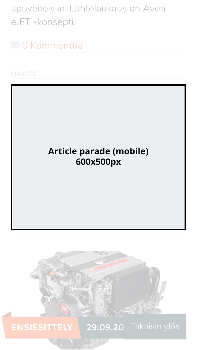 - With mobile banners, take into account that the banners will be scaled to 300x300px (Mobile panorama) or 300x250px (Article parade) depending on the device’s screen size.